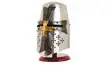 Heaume de chevalier en métal, avec une croix templière noire en relief et une autre plus petite en laiton.